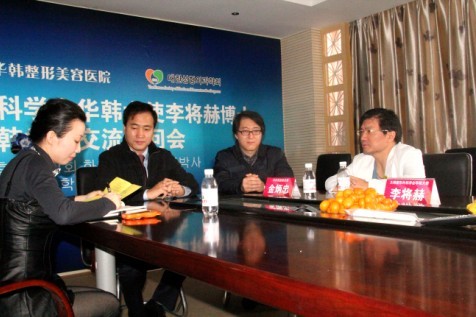 在華韓四樓會議室學術訪問交流會期間,李將赫大使與金炳中秘書長和李東尹博士一起,與華韓的全體中韓醫(yī)生一起,在全面部無痕除皺、假體隆胸、腰腹吸脂塑身、自體鼻中隔隆鼻、無痕重瞼開眼角等學術,進行了深入探討與交流,在學術交流訪問會間隙,李將赫大使接受了記者的采訪。